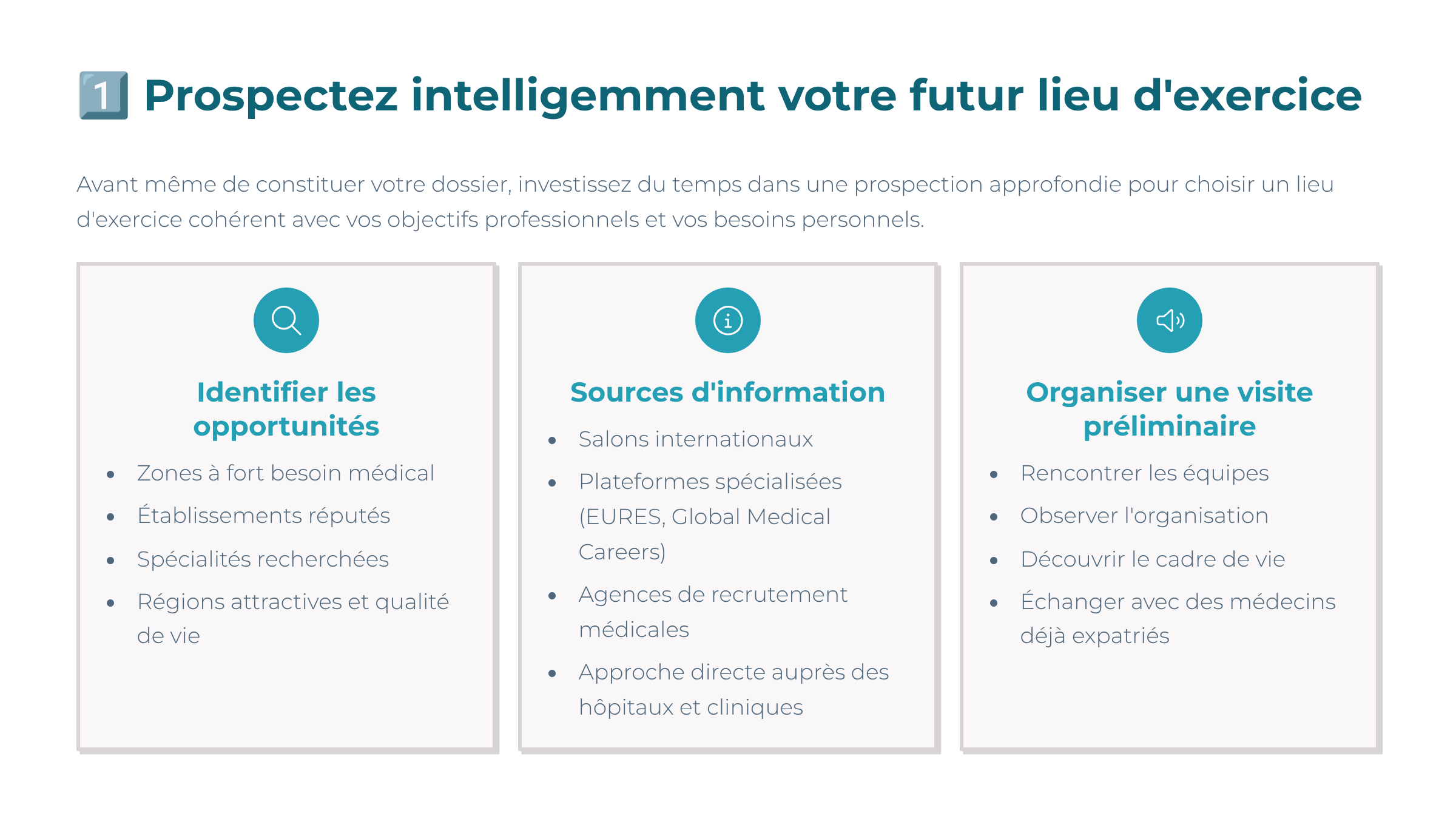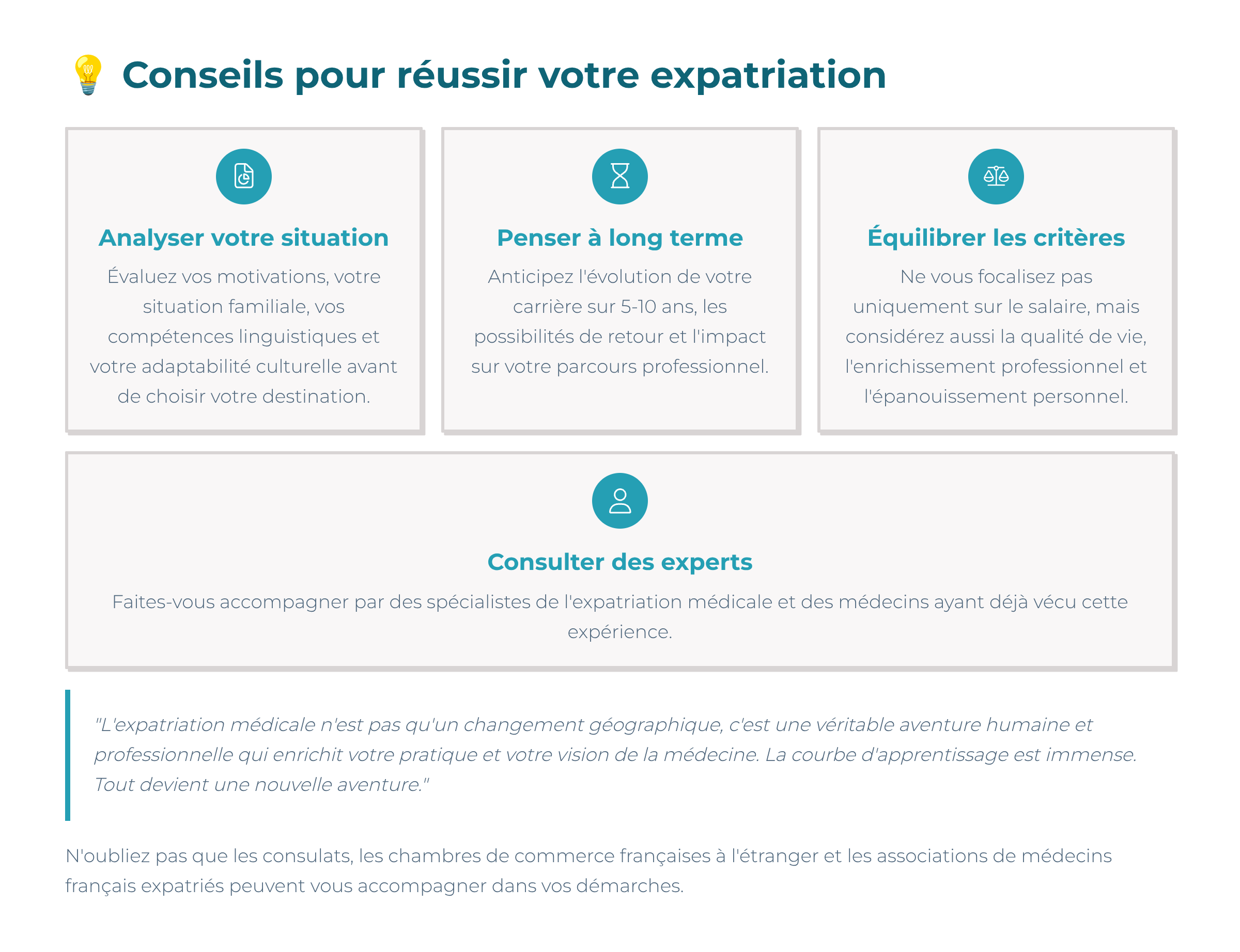 • Conseil : visitez le site, rencontrez les Ă©quipes et Ă©changez avec des mĂ©decins dĂ©jĂ  expatriĂ©s.