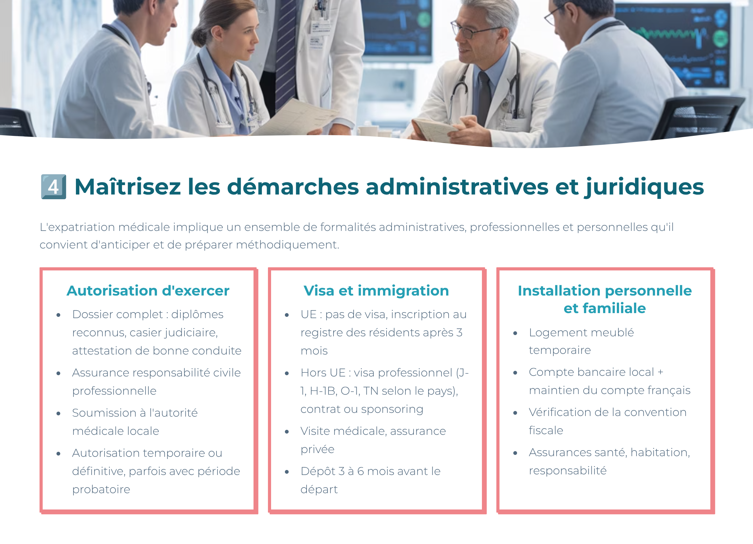 • 3-6 mois : visa, autorisation d’exercer, analyse juridique, logement et Ă©coles.