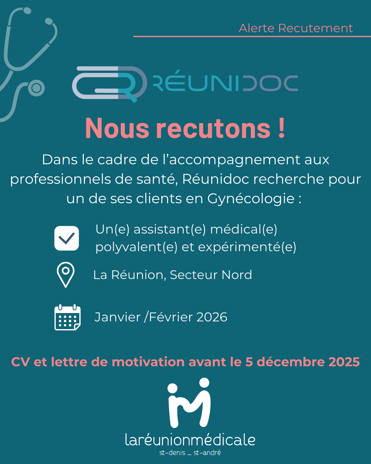 Dans le cadre du développement du cabinet de gynécologie de La Réunion Médicale avec l’arrivée de nouveaux médecins et un déménagement courant 2026, nous recherchons un(e) Secrétaire Médicale polyvalente pour venir compléter une équipe de 7 secrétaires dynamiques et expérimentées sur le secteur Nord St Denis.